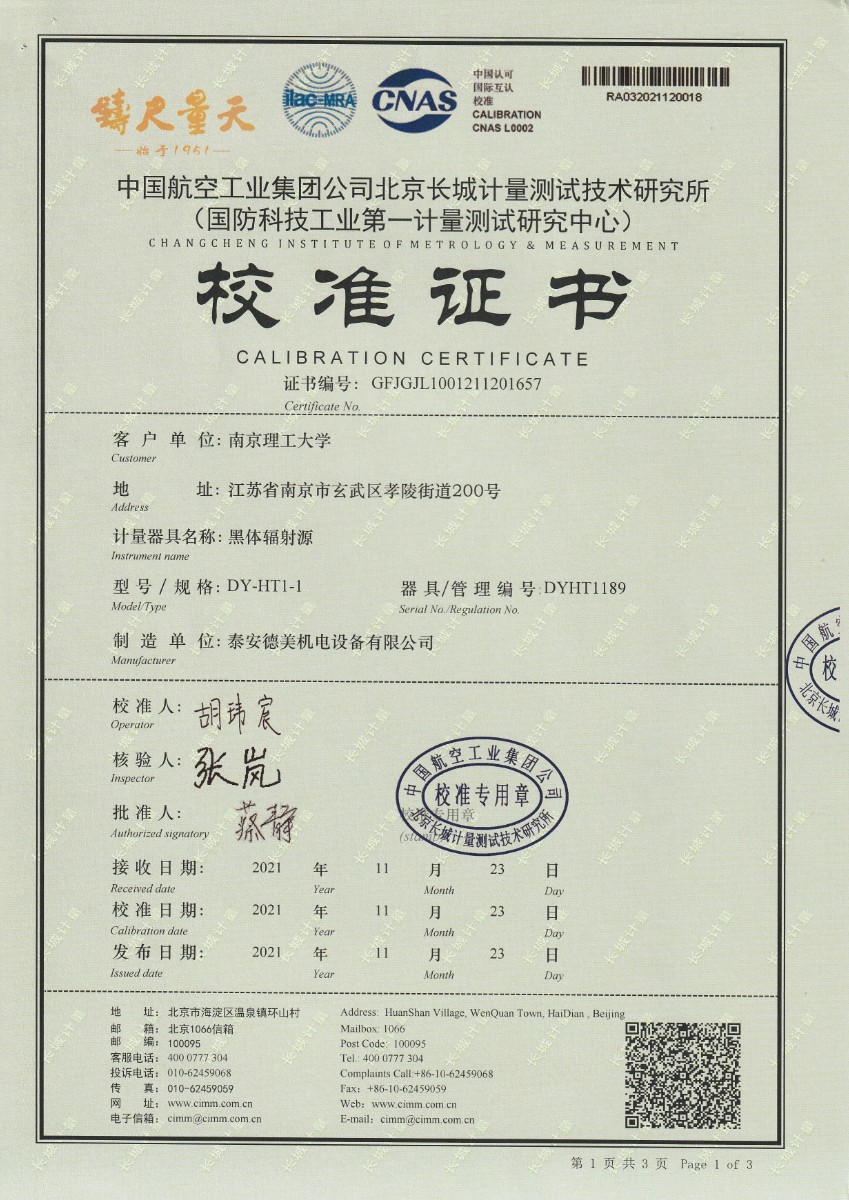 南京理工大學-黑體輻射源校準證書-30-20℃ 2021-12-4 本文被閱讀 12290 次
