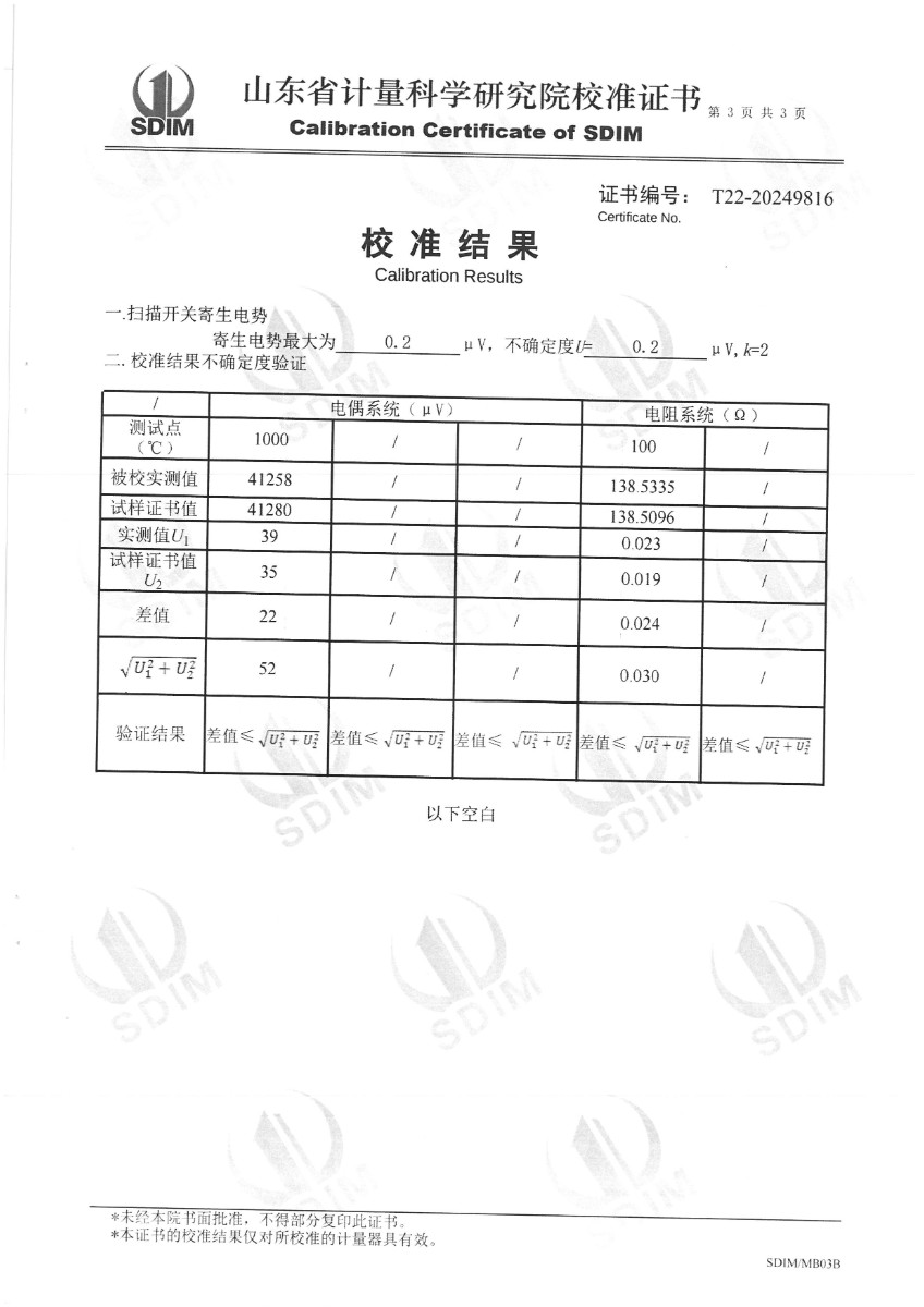 熱電偶、熱電阻自動檢測系統(tǒng)校準證書