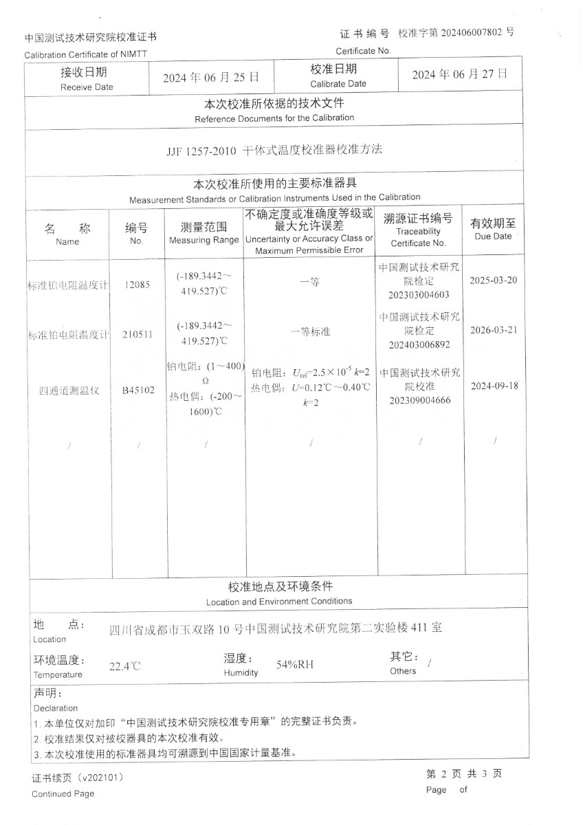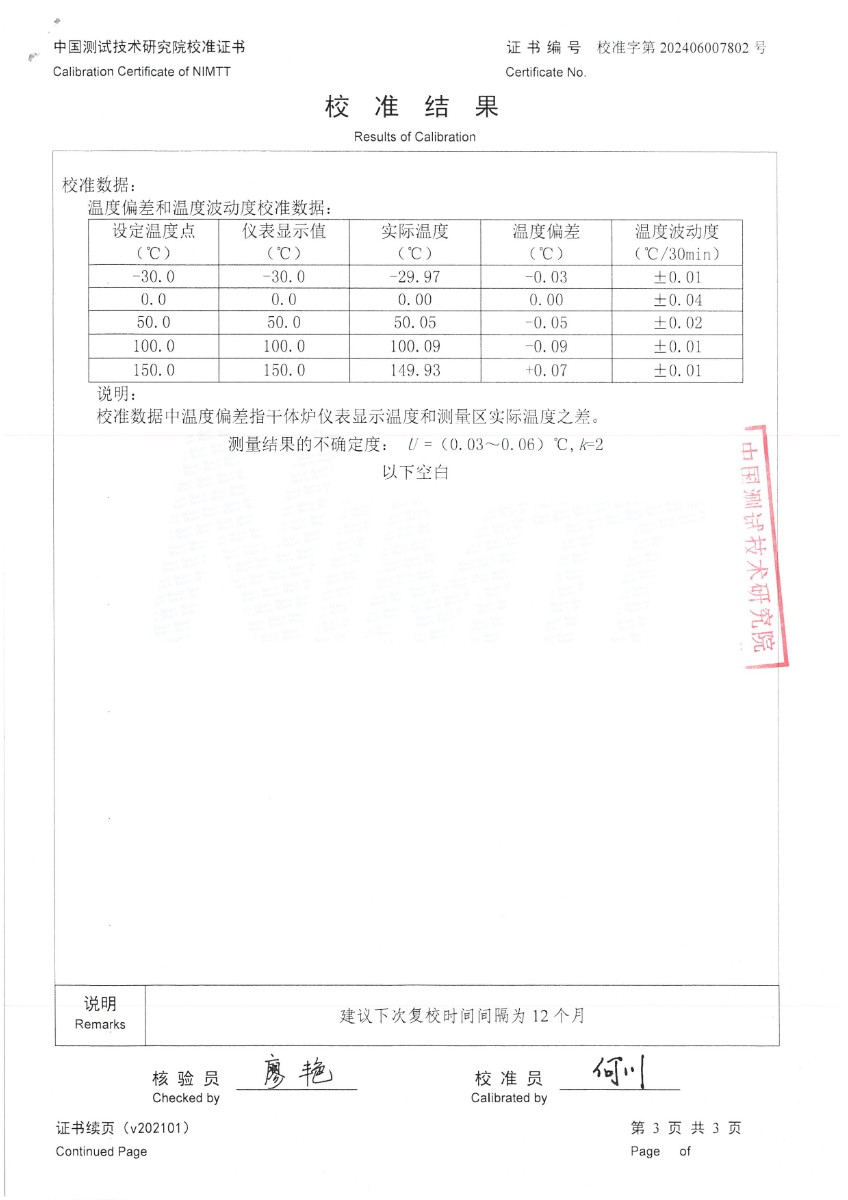 低溫干體爐(-30~150℃)校準(zhǔn)證書 2024-7-1 本文被閱讀 5792 次