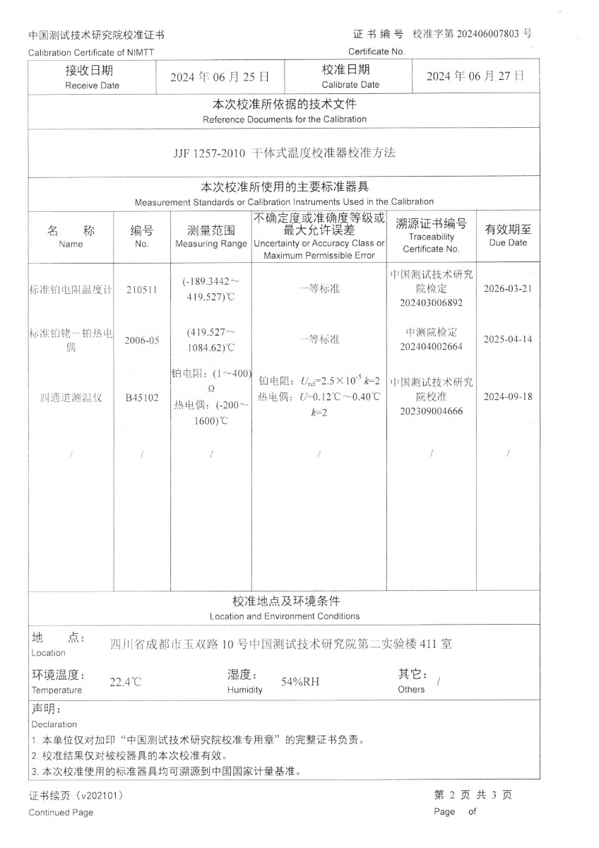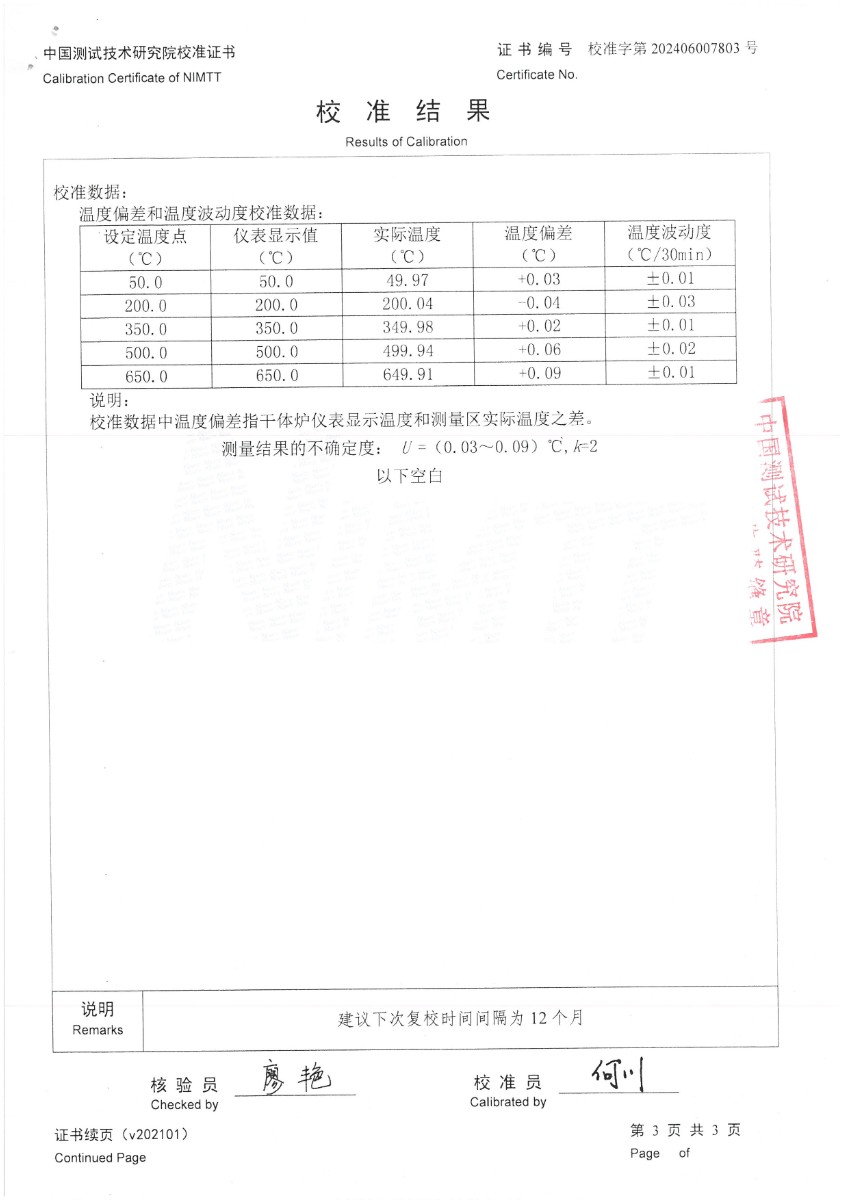 中溫干體爐(50~650℃)校準證書 2024-7-1 本文被閱讀 6264 次