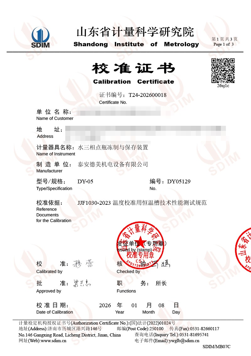 水三相點瓶凍制與保存裝置校準證書 2026-1-13 本文被閱讀 1461 次