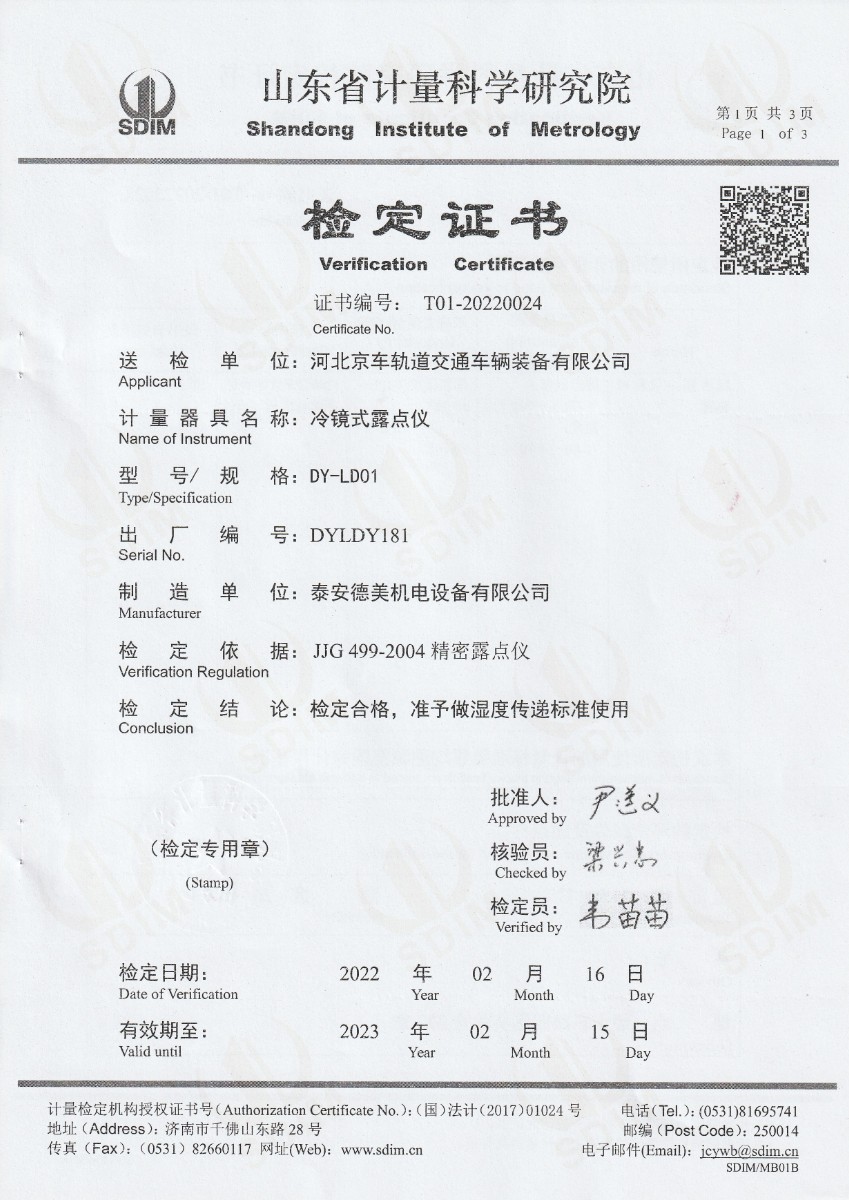 河北京車軌道交通車輛裝備有限公司-冷鏡式露點(diǎn)儀檢定證書 2022-2-23 本文被閱讀 13107 次