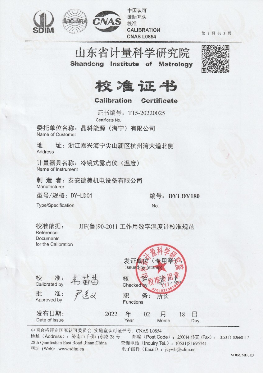 晶科能源(海寧)有限公司-冷鏡式露點儀(溫度)校準證書 2022-2-23 本文被閱讀 14176 次