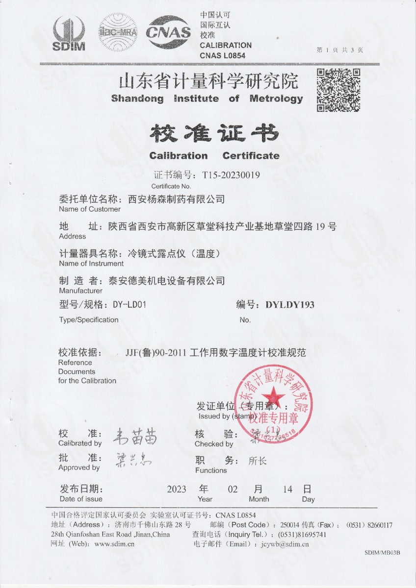 上一條:西安楊森制藥有限公司 冷鏡式露點(diǎn)儀 檢定證書下一條:冷鏡式露點(diǎn)儀校準(zhǔn)證書